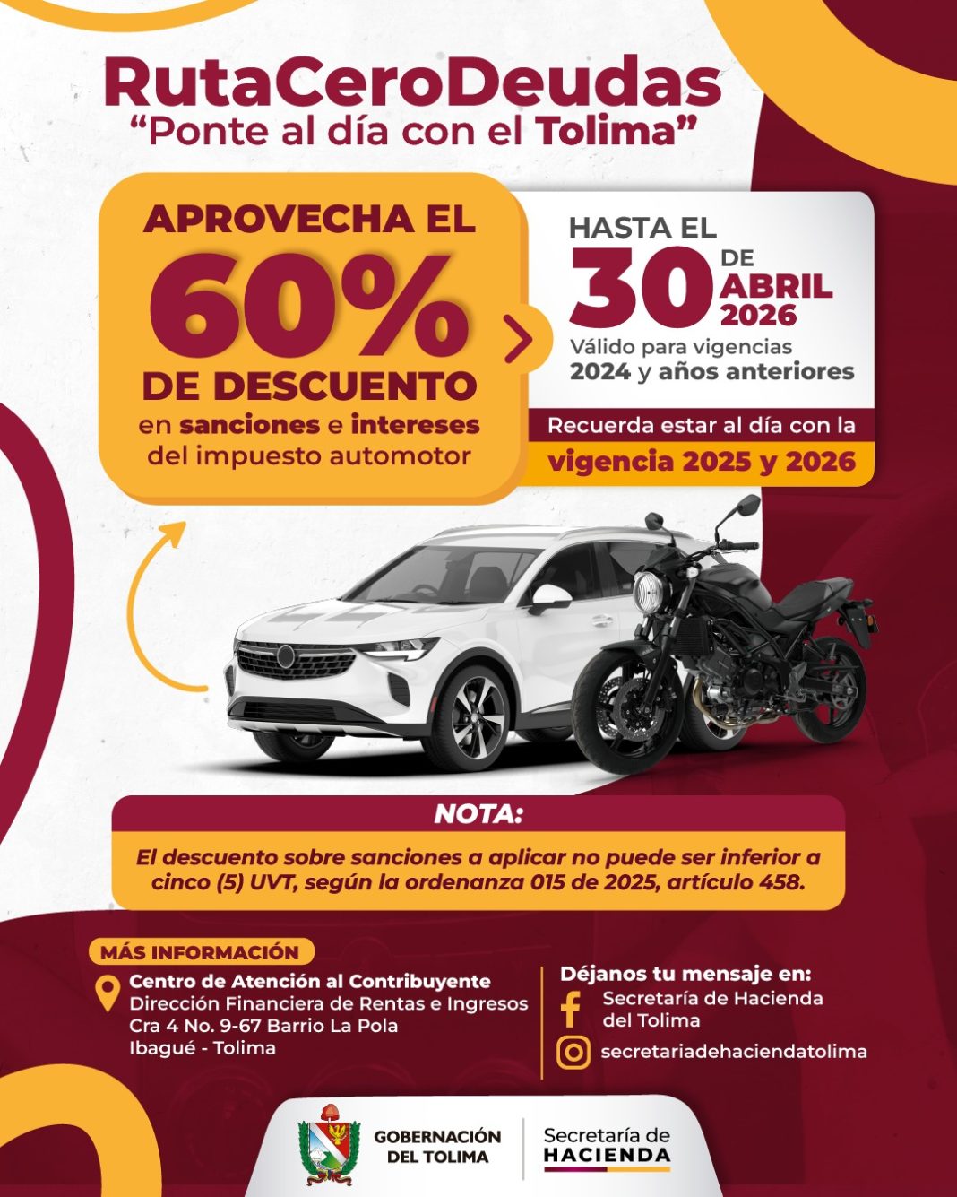 Ibagué, 5 de febrero de 2026 – La Dirección Financiera de Rentas e Ingresos de la Secretaría de Hacienda Departamental del Tolima, Cielo Guayara Monroy, invitó a los contribuyentes a que aprovechen la segunda fase de beneficios para el pago del Impuesto de Vehículos, que contempla un descuento del 60% en intereses y sanciones, vigente hasta el próximo 30 de abril.
