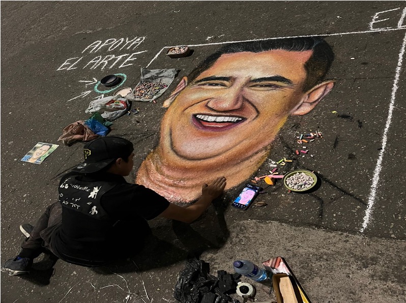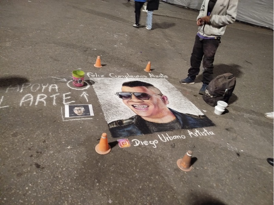 Un artista retrató en el piso del Simón Bolívar a Feizar Orjuela Aponte “El Heredero” recordado por su canción coqueta, uno de los grandes íconos de la carranga.Foto: Natalia Messa