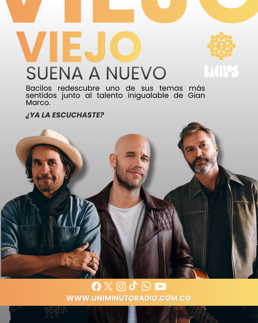 La emblemática agrupación Bacilos presenta una nueva versión de su clásico “Viejo”, esta vez, junto al reconocido cantautor peruano Gian Marco. Se trata de la primera colaboración oficial entre ambos artistas, una unión que llega para reinterpretar una canción que forma parte esencial de la historia de la banda y del pop latino.