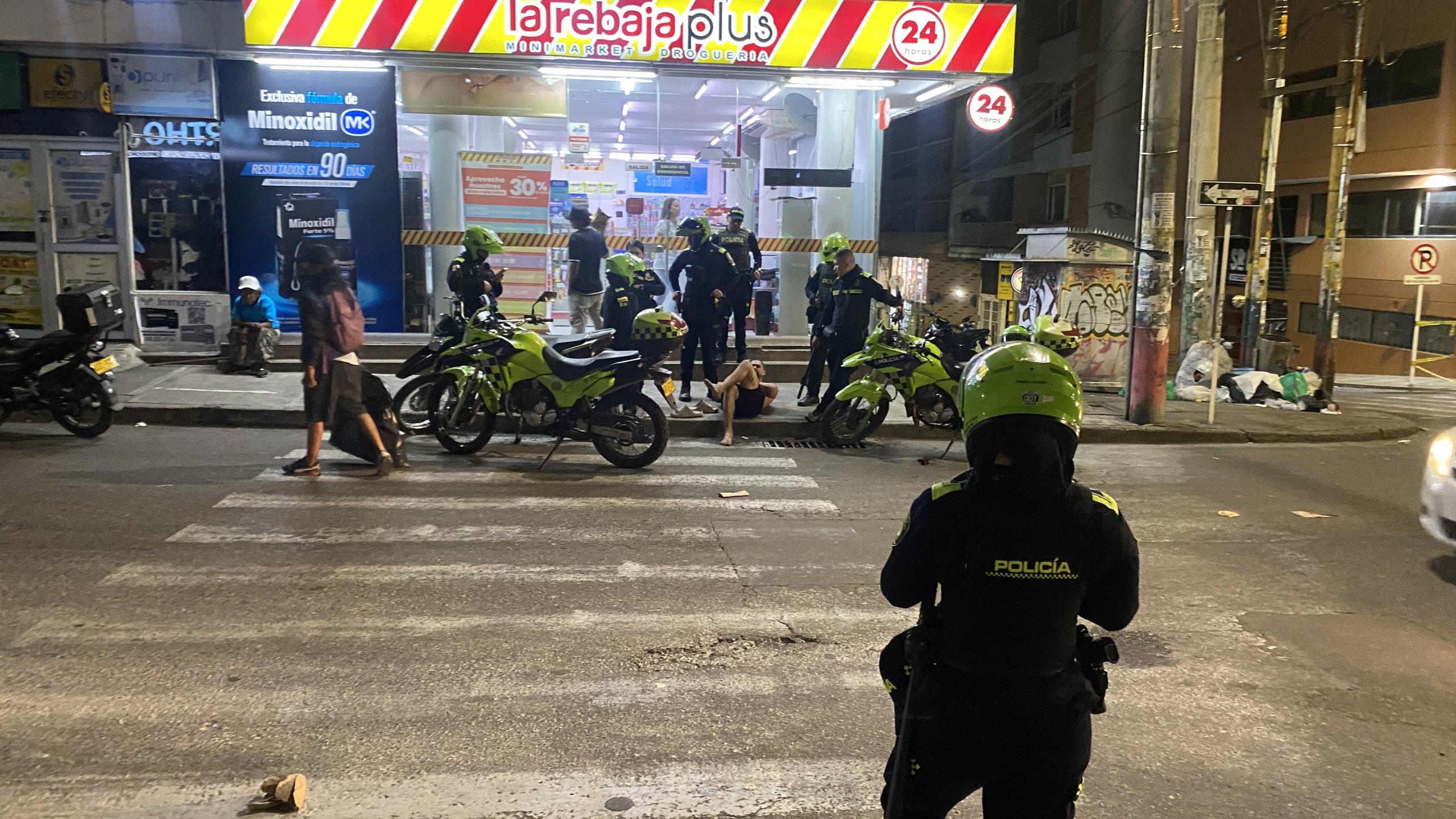 Los hechos se desencadenaron alrededor de las 8:00 p.m., cuando transeúntes presenciaron un enfrentamiento verbal entre dos agentes de la Policía y un hombre, presunto habitante de calle. Lo que inició como una discusión de causas aún no esclarecidas, escaló rápidamente a una persecución cuando el sujeto, en su intento por evadir a las autoridades, buscó refugio en la Droguería La Rebaja, ubicada en la esquina de la Carrera 4.ª con Calle 11.