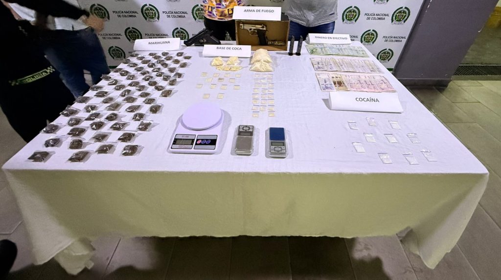 La primera diligencia se llevó a cabo en el barrio Portal del Bunde, donde se logró la captura en flagrancia de un hombre de 33 años y una mujer de 26 años. En el procedimiento se incautó un arma traumática tipo pistola calibre 9 mm con dos proveedores, tres cajas con un total de 107 cartuchos para pistola traumática, 390 gramos de bazuco y dos grameras. Los capturados fueron dejados a disposición de la autoridad competente por los delitos de tráfico, fabricación o porte de estupefacientes y fabricación, tráfico, porte o tenencia de armas, accesorios, partes o municiones.