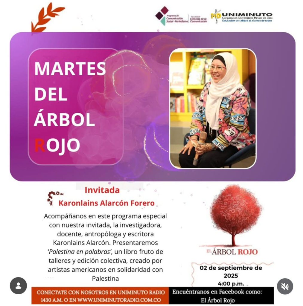 En una tarde cargada de sensibilidad y conciencia, el programa El Árbol Rojo, dirigido por Natalia Montejo, abrió su espacio a una conversación tan necesaria como luminosa. La invitada fue Karolains Alarcón Forero, antropóloga, maestra en Escrituras Creativas y escritora tolimense, creadora del proyecto “Palestina en palabras”, un libro colectivo que surge como respuesta poética ante el genocidio que sufre el pueblo palestino.