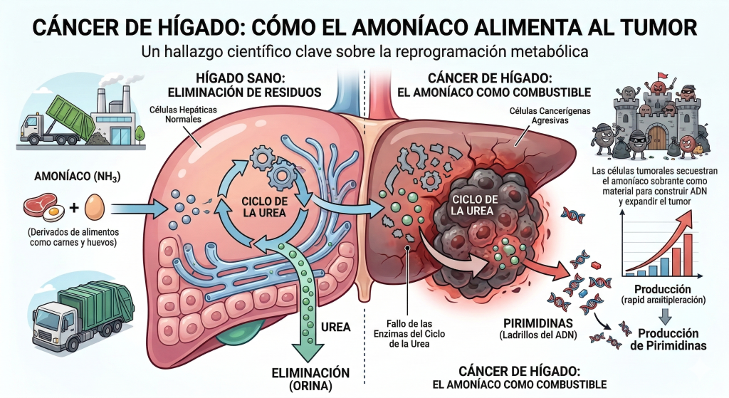 La investigación, liderada por un equipo multidisciplinario internacional, marca un cambio de paradigma al mostrar que ocurre exactamente lo contrario: la incapacidad del hígado para limpiar el nitrógeno es lo que ayuda a que el cáncer progrese.
