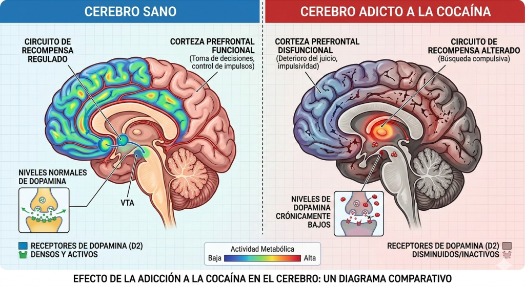 Los investigadores descubrieron que, tras el consumo repetido de cocaína, este circuito experimenta un cambio drástico.