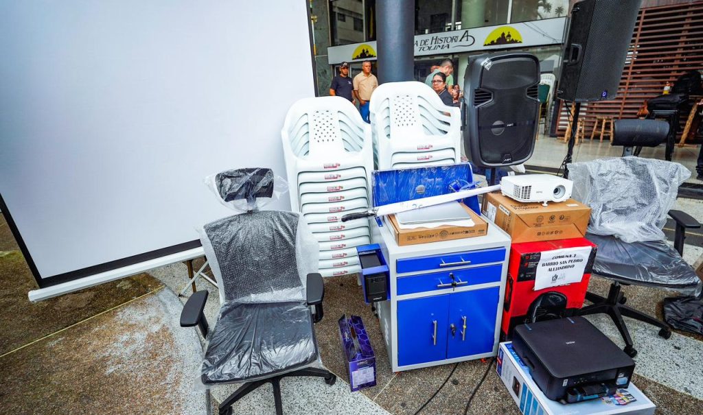 Ibagué, 19 de diciembre de 2025 – Cada junta que cumplió con los requisitos recibió un kit integral conformado por: portátil, módulo, impresora, UPS, silla ejecutiva, video beam, telón, dos carpas, 25 sillas plásticas, cabina de sonido y dos micrófonos. Estos elementos permitirán mejorar la gestión comunitaria, la realización de encuentros ciudadanos y el acceso a herramientas TIC.