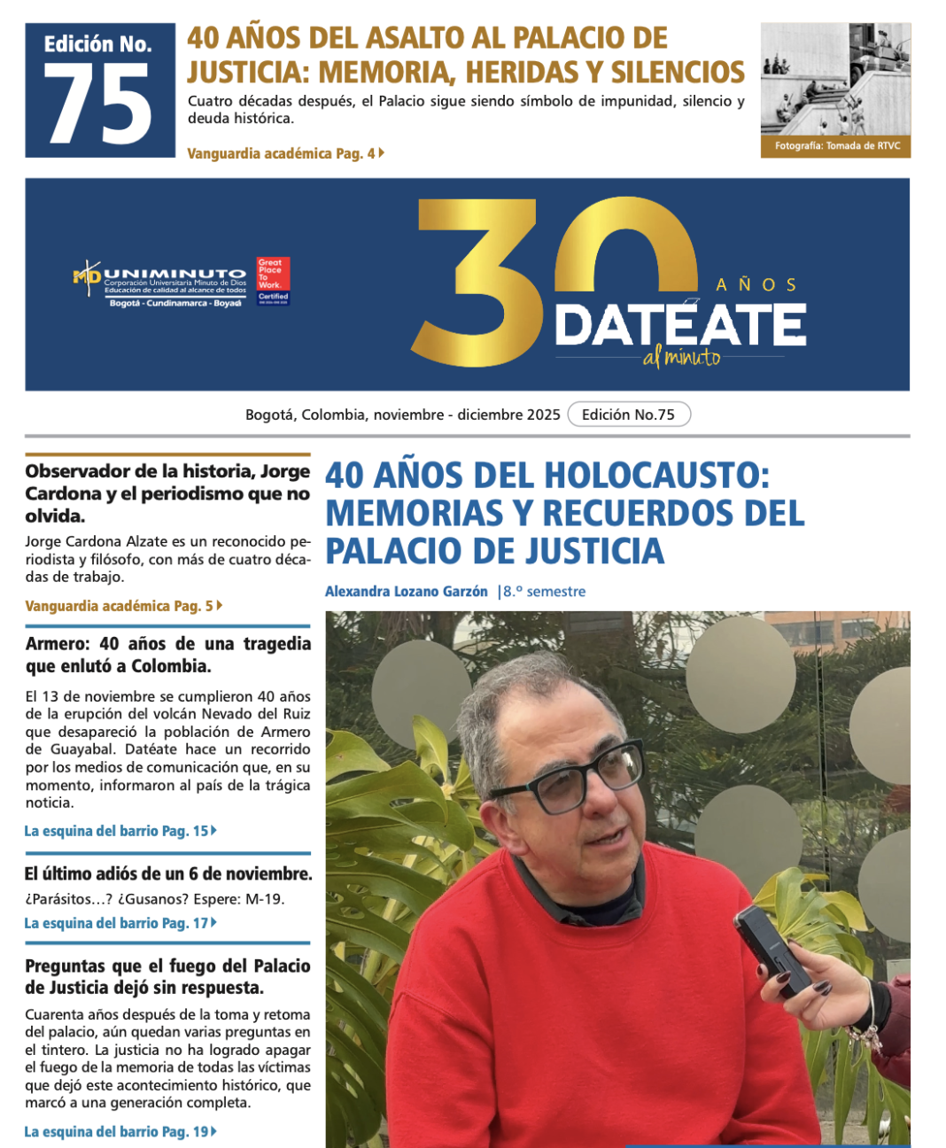- La portada de esta edición nos muestra el recorrido tras los 40 años del holocausto del Palacio de Justicia, desde la toma del M-19 hasta la retoma militar, poniendo en el centro a las víctimas, los desaparecidos y la deuda de verdad que el Estado aún no salda.