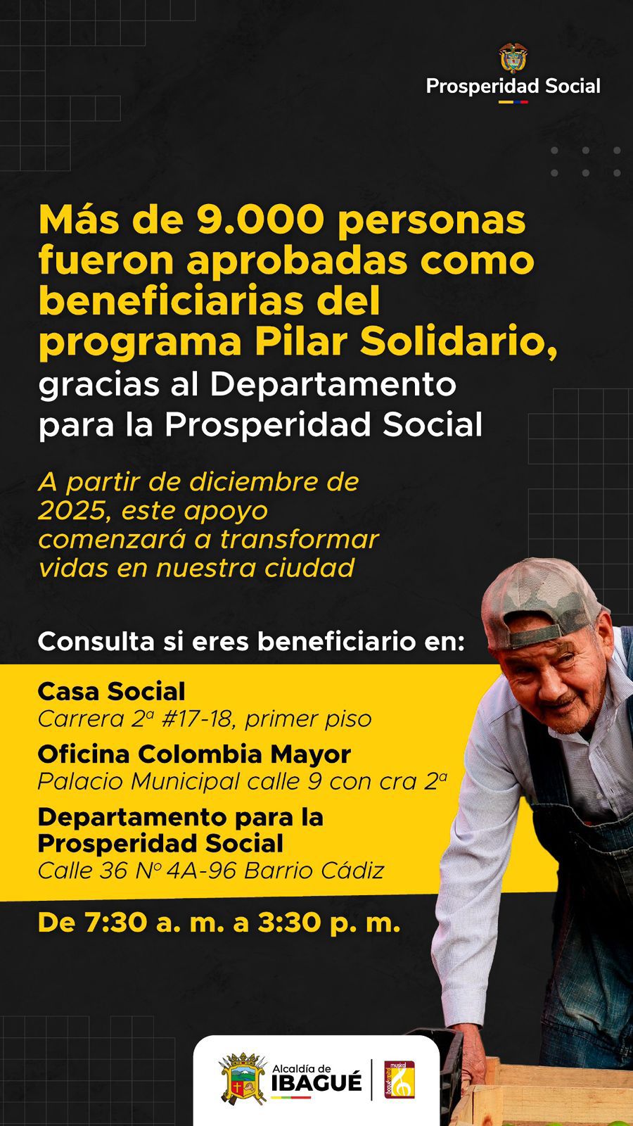 Ibagué, 19 de diciembre de 2025 – Buenas noticias para la población mayor de Ibagué: más de 9.200 personas fueron aprobadas como beneficiarias del programa ‘Colombia Mayor – Pilar Solidario’. El apoyo económico comenzará a entregarse después del 23 diciembre, gracias al trabajo conjunto con el Departamento para la Prosperidad Social, lo que permitió ampliar los cupos y llegar a más ciudadanos que lo necesitan.
