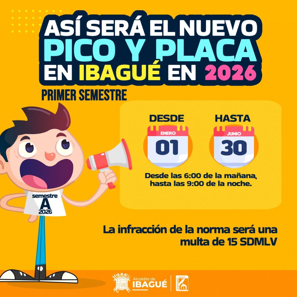 Ibagué, 26 de diciembre de 2025 –La Administración Municipal informa que mediante el Decreto 0768 del 26 de diciembre del 2025, se implementa la nueva rotación de la medida de Pico y Placa, la cual regirá durante el primer semestre del año 2026, desde el primero de enero hasta el 30 de junio.