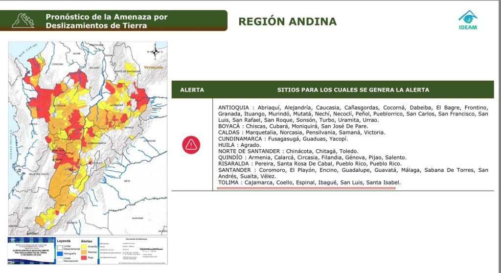 Por otro lado, se genera otra alerta roja por pronóstico de la amenaza por deslizamiento de tierra, que puede producir emergencias en zonas de alto riesgo en Ibagué, sobre todo en sectores como las comunas 2, 6, 7, 12 y 13.