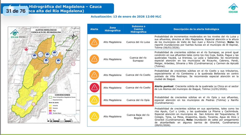 Ibagué, 14 de enero de 2026 – Debido a las altas precipitaciones de los últimos días en gran parte del país, el Instituto de Hidrología, Metereología y Estudios Ambientales, Ideam, emitió algunas alertas, entre esas en la región Andina, donde se ubica a Ibagué.