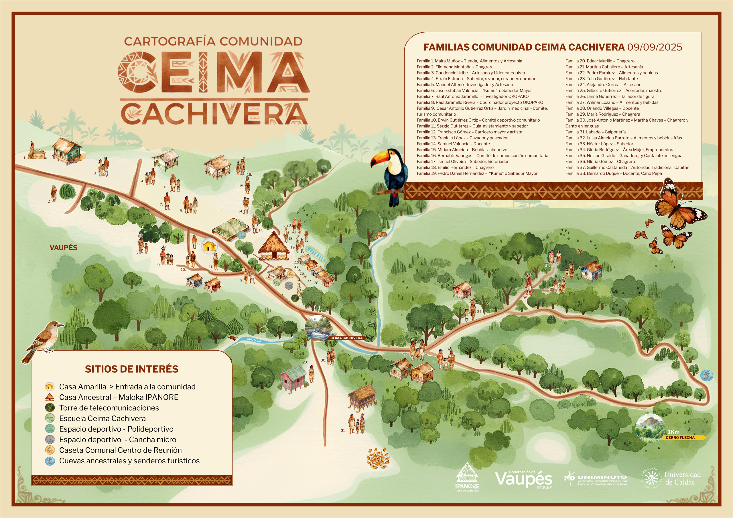 Ceima Cachivera está conformada por treinta y ocho (38) familias pertenecientes a diferentes etnias: Tucano, Cubeo, Yurutí, Wanano, Desano, Piratapuyo, Barasano, Makuna, Siriano, Itano y Bará. Su territorio se extiende entre selvas, caños y lagunas, espacios que desde su cosmovisión son sagrados y vitales para la subsistencia y preservación de saberes ancestrales. La comunidad se organiza en torno a prácticas tradicionales como la agricultura familiar, la pesca y la elaboración de artesanías, actividades que reflejan una relación profunda con la naturaleza y el territorio que habitan.
