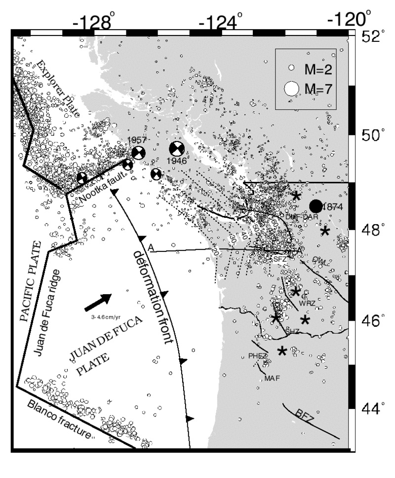 Los científicos encontraron el laboratorio perfecto en la costa de la isla de Vancouver, en el norte de Cascadia1. En esta compleja triple unión, se encuentran cuatro placas: la del Pacífico (PAC), la de América del Norte (NA), la de Juan de Fuca (JdF) y la pequeña microplaca Explorer (Exp).