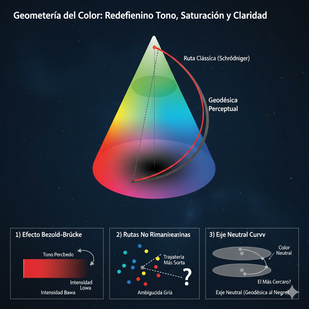 Rutas curvas: el camino para mantener un “mismo tono” mientras cambia el brillo no es una recta, sino una curva (una geodésica). Es como si, para ir de un punto A a un punto B en este mapa, el ojo prefiriera seguir la forma del terreno en lugar de atravesar la montaña.