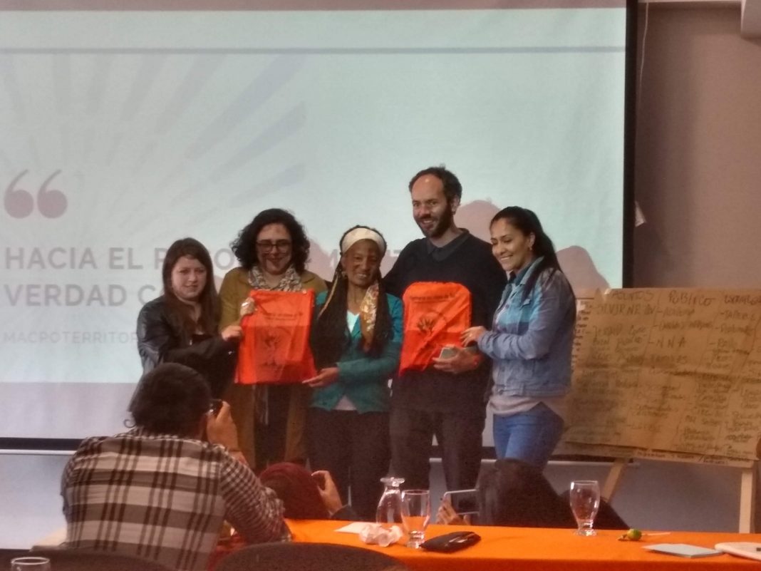 El grupo de tejedoras hace entrega a la Comisión de la verdad una de sus “cajas de herramientas”con las cuales bordan el proceso de su historia en el conflicto armado Trabajo de creación de estrategias para la construcción de la verdad a tarvés de los testimonios de los actores del conflicto. Concurso por grupos acerca de la misión de la Comisión de la verdad y el proceso de justicia transicional y socialización de estrategias. Entrega de material por parte de la comisión de la verdad. Muestra del trabajp de las tejedoras por la memoria, cada puntada cuenta la historia de alguna de ellas dentro del conflicto. Algunas de las asociaciones que participaron dentro del taller mostraron sus avances como organización