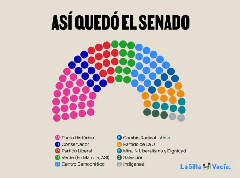 El resto de las curules se distribuyó entre otras fuerzas políticas: Cambio Radical alcanzó cerca de 9 escaños, la Alianza Verde alrededor de 8, mientras que partidos y coaliciones más pequeñas, como el Movimiento de Salvación Nacional, Fuerza Ciudadana y otras alianzas, lograron representación menor en la cámara alta.