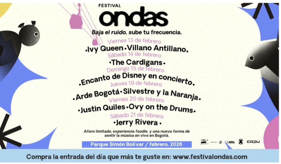 El Festival Ondas libera combos con descuento para quienes quieran vivir el festival completo que se realizará del 13 al 21 de febrero, con apertura de puertas entre 4:00 y 5:00 p.m. y conciertos desde las 8:00 p.m. en el Parque Metropolitano Simón Bolívar, con las presentaciones de Ivy Queen, The Cardigans, Arde Bogotá y Jerry Rivera lideran seis noches de conciertos junto a talento local, con combos disponibles para vivir más de una fecha.