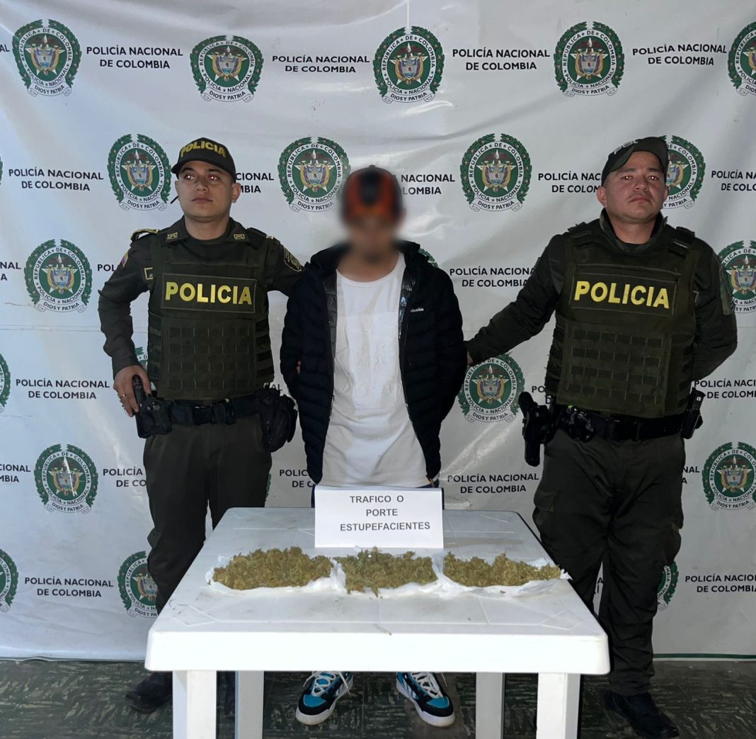 Al realizar el respectivo registro e identificación a persona, se le halló en el interior de una chaqueta tres bolsas que contenían aproximadamente 180 gramos de marihuana, motivo por el cual fue capturado de manera inmediata.
