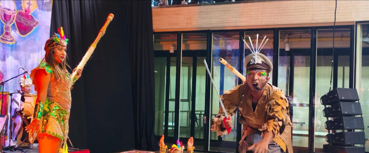 El vestuario, por su parte, aporta otra capa de lectura. No se limita a lo estético, sino que sugiere diferencias claras entre grupos. Algunos personajes portan elementos que remiten a lo ancestral, con colores, texturas y adornos que evocan una conexión con la tierra. Otros presentan vestimentas más estructuradas, con tonos neutros o definidos, que pueden asociarse con orden, imposición o jerarquía. Incluso dentro de estos grupos hay variaciones que permiten percibir niveles: figuras más ornamentadas, más elevadas o visibles frente a otras más sencillas o cercanas al suelo. Así, el vestuario contribuye a construir una especie de mapa social dentro del escenario.