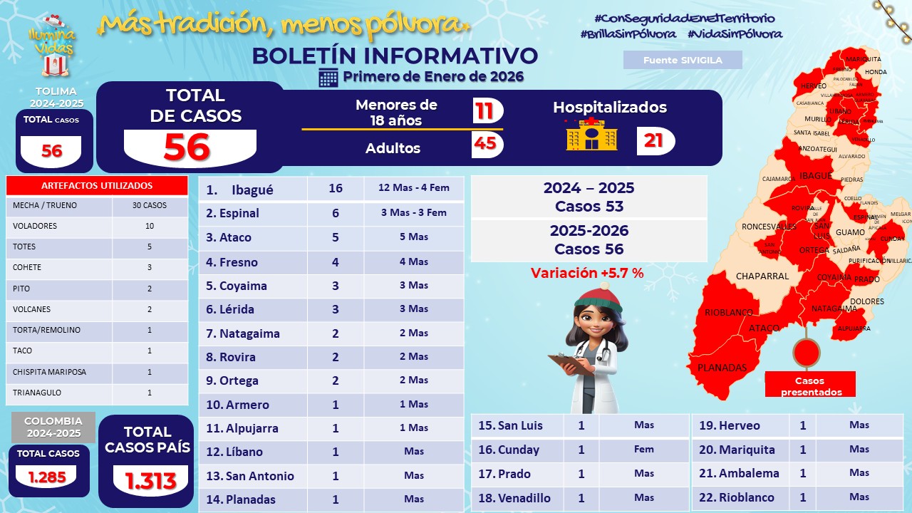 Ibagué, enero 2 de 2026 – Con un llamado urgente a la prevención, la Secretaría de Salud del Tolima presentó el balance de personas lesionadas por pólvora con corte al 2 de enero de 2026; registrando un total de 56 casos, de los cuales 11 corresponden a menores de edad y 45 a personas adultas.